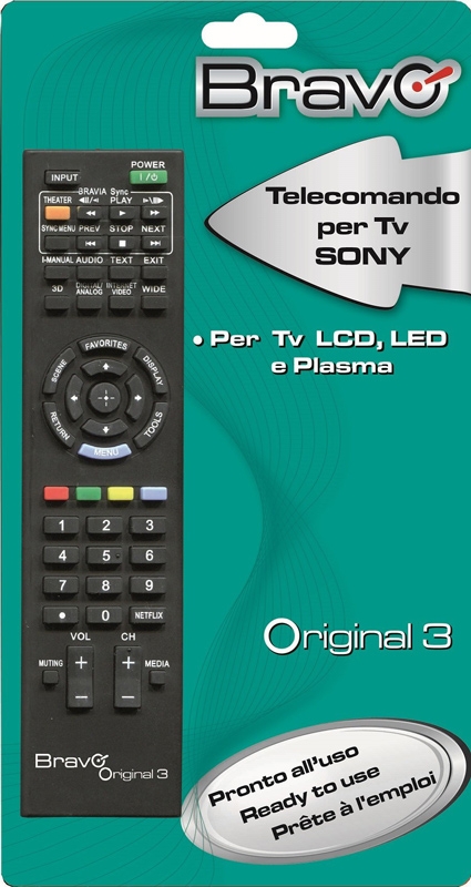 Voorgeprogrammeerde afstandsbediening, geschikt voor elke Sony TV. Gebruikt dezelfde symbolen als de originele afstandsbediening. Merk Bravo.