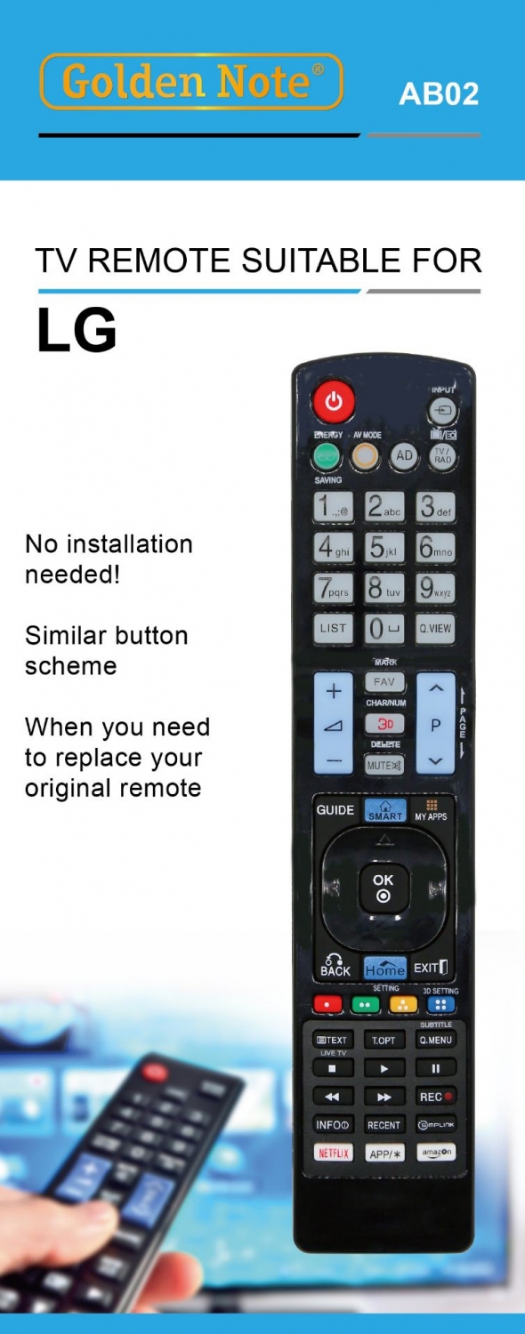 Voorgeprogrammeerde afstandsbediening, geschikt voor elke LG TV. Gebruikt dezelfde symbolen als de originele afstandsbediening. Merk Golden Note