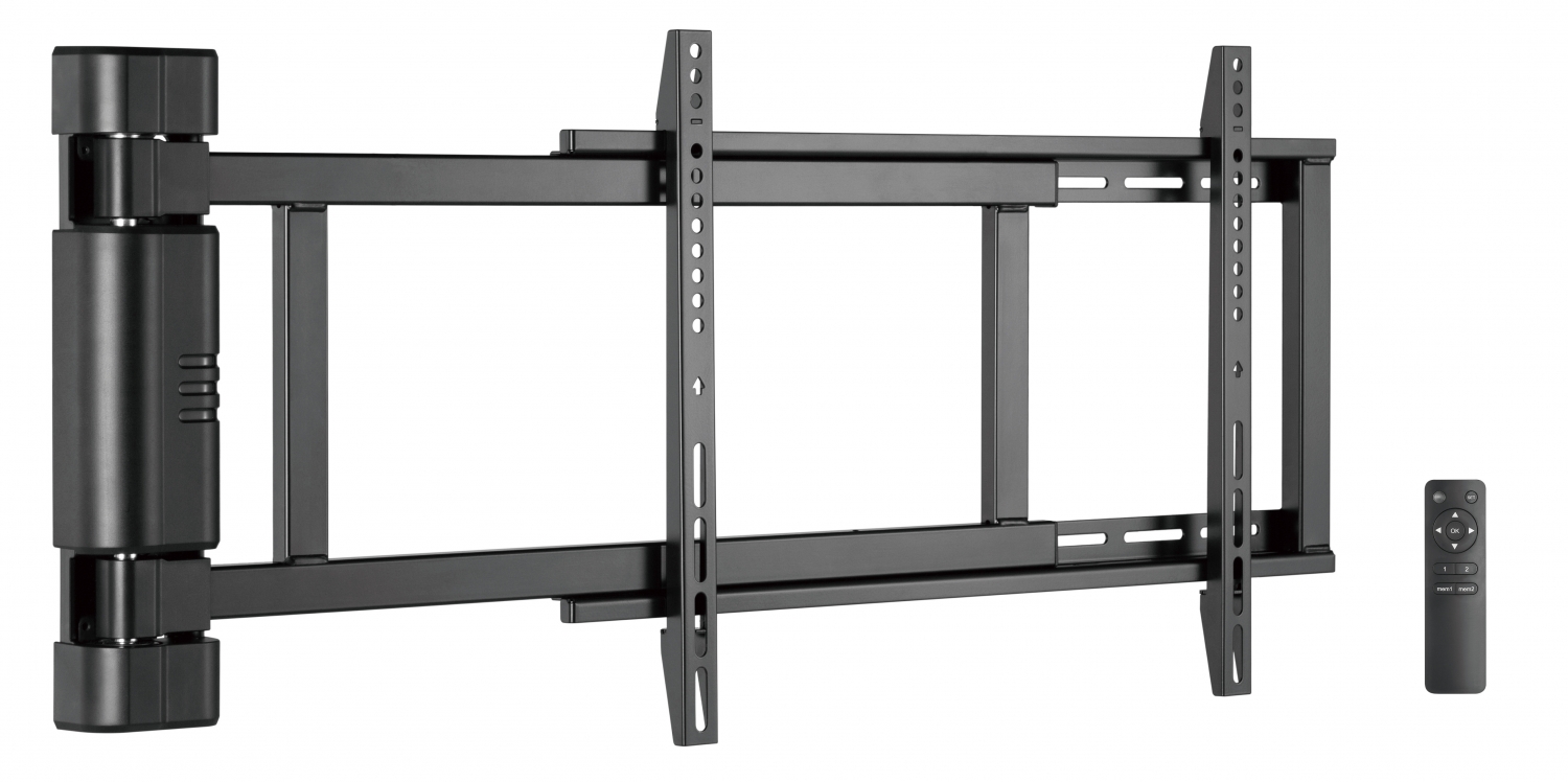 De TV-beugel kan op afstand bediend worden met behulp van de afstandsbediening (batterijen niet meegeleverd). Je kunt de beugel uitklappen, inklappen en draaien van een afstand. Daarnaast kun je twee verschillende standen opslaan, waardoor je de televisie of het scherm altijd gemakkelijk in exact dezelfde positie kunt plaatsen. Dit is super handig voor bijvoorbeeld presentaties op de werkvloer, of wanneer je voor verschillende zitplaatsen de ideale hoek wil vastleggen. Dankzij de veiligheidsstand stopt de motor van de muurbeugel zodra er een object in de weg staat. Dit voorkomt verwondingen en maakt het systeem uiterst veilig.