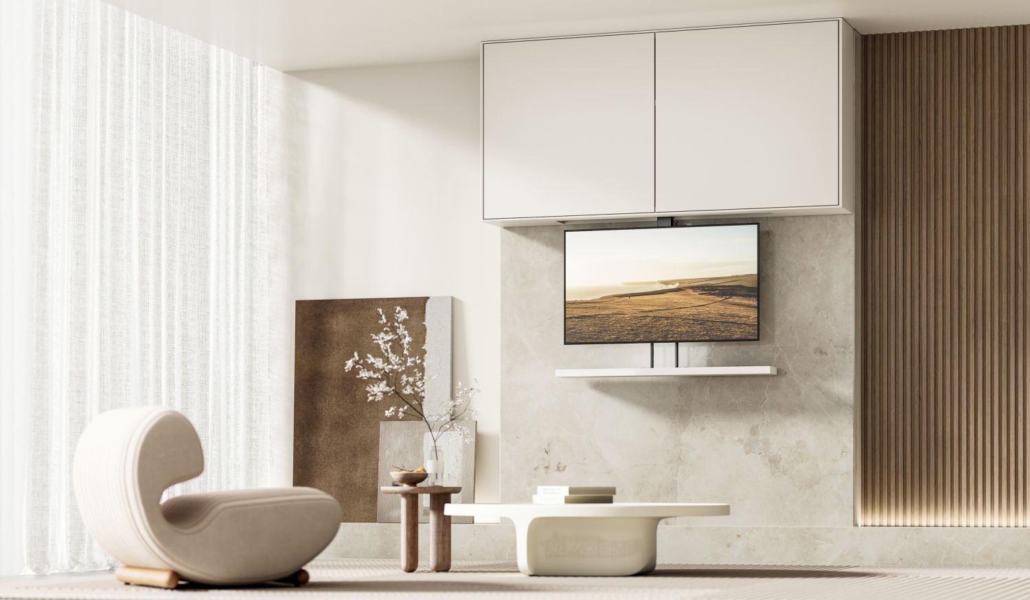 Met deze TV-lift laat je je scherm soepel omhoog of omlaag komen, precies zoals jij het wilt. Bedien hem eenvoudig met één druk op de knop van je afstandsbediening, je smartphone of je stem. Veilig, stijlvol en geschikt voor elk interieur.