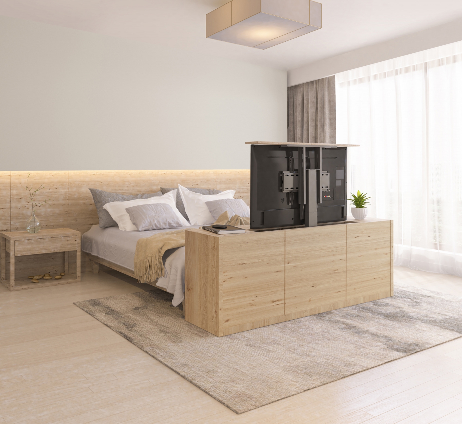 De TV-lift houdt je televisie netjes uit het zicht,. Zo kun je je televisie in een kast wegwerken of aan het voeteneind van je bed . Met de afstandsbediening laat je de gemotoriseerde lift je televisie zakken en omhoog halen.