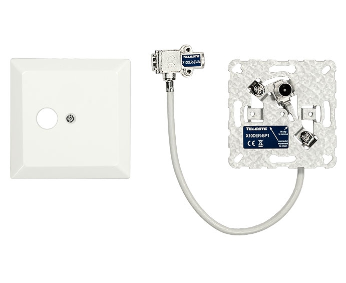 De X10DER-KT-01 is een enkelgats einddoos voorzien van klem met IEC connector, een mounting plaat en afdekplaat. Makkelijk bij installatie en om te korte kabels te verlengen.