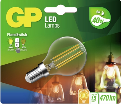 Zeer zuinige GP led Kogel filament FlameSwitch 4w e14 (40w) warm wit licht
